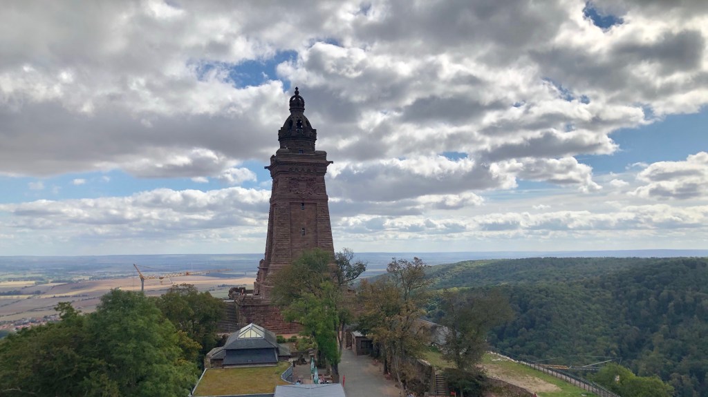 Oberhalb von Bad Frankenhausen befindet sich ein Gebäude, dass aus der Ferne wie ein überdimenionierter Elefantenschuh aussieht: Das Panoramamuseum, in dem das 14m hohe und 123m umfassende Monumentalgemälde „Frühbürgerliche Revolution in Deutschland“ von Werner Tübk ausgestellt wird. Die Hauptattraktion ist aber das 81 m hohe Kyffhäuser-Denkmal, das als Fixpunkt auf des Berges Spitze thront. Der Sage nachempfunden, schläft dort der in Stein gehauene Barbarossa. Über ihm reitet Kaiser Wilhelm I., zu dessen Ehren das Denkmal von 1890 bis 1896 erbaut wurde. 247 Stufen führen ganz bis nach oben. Bei 8,50 Eintritt koste ich natürlich jede Stufe aus, ist ja schließlich bezahlt. Von oben habe ich grandiosen Rundblick über die Goldenen Aue bis zum Brocken im Harz.