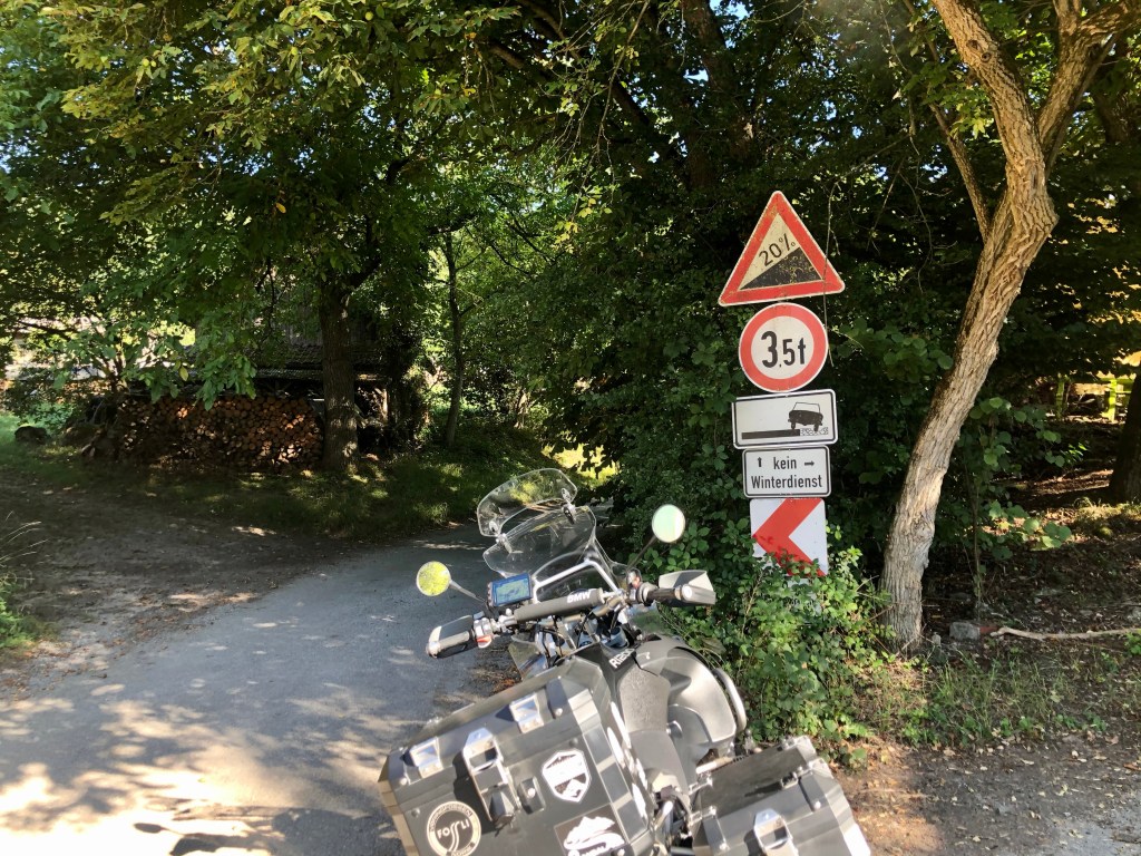 Es ist Mittwoch morgens, ich habe einige Tage Zeit und werde auf den schönen deutschen Landstraßen meinen Weg nach Lübeck machen. Am Sonntag will ich wieder in Stuttgart sein. Erstmal tanken und Visier putzen, dann auf die Schnellstraße Richtung Norden. Schon in Mittelsteinbach findet sich die erste steile Auffahrt auf der Route: Eine Steigung von 20% durch den Wald ist zu absolvieren. Doch es wird nicht die steilste Straße meiner Ausfahrt werden….