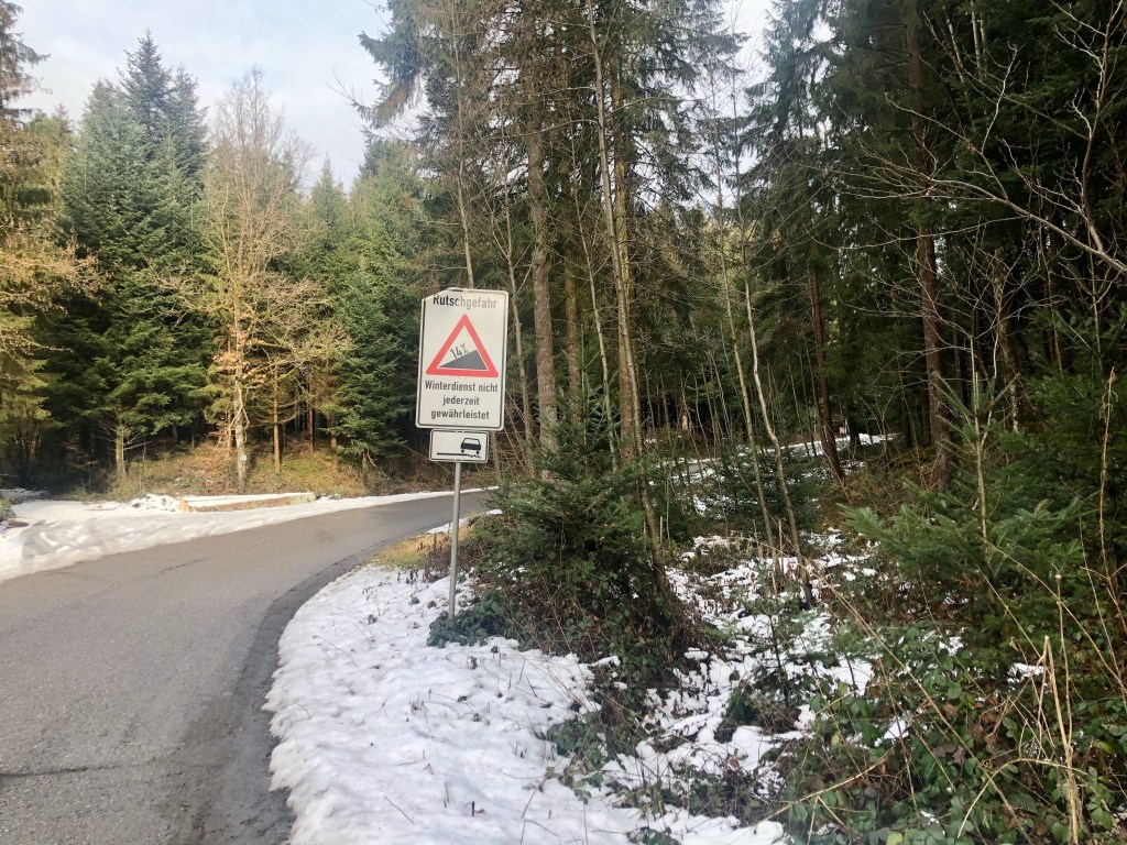 Im Sommer ist die Zachersmühle in Adelberg ein schönes Ausflugsziel. Hier kann man gut einkehren bei Flammkuchen oder Spätzle und man kann die Esel ansehen. Heute ist hier allerdings nichts davon zu sehen. Stattdessen ist der Straßenrand weiß veredelt. Hier heißt es natürlich, besonders vorsichtig fahren.