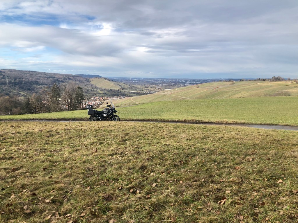 Den Weinbauern hier wird es offenbar auch im Winter nicht langweilig. Als ich durch die Hügel mit den kahlen Rebstöcken fahre, sehe ich überall die Winzer an ihren Rebstöcken herumwerkeln. Auch sie nutzen die heute milden Temperaturen. Ich vermute, für den Rebschnitt. Ich dagegen nutze die Aussicht für ein Photo, bevor ich wieder auf die Zielgerade nach Hause einbiege.