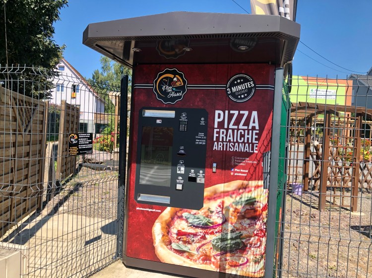 Unterwegs möchte ich eine der wichtigsten technischen Errungenschaften des modernen Fastfood versuchen. Schon vor einiger Zeit sind sie mir im Elsass immer wieder mal aufgefallen: Pizzaautomaten! Heutzutage kann man ja schon alles Mögliche aus dem Automaten kaufen: Wurst, Käse, Cola, Schokoriegel…aber Pizza? Kann ich mir gar nicht vorstellen, dass eine Pizza aus dem Automaten gut schmecken kann! Andererseits: Ich habe auch schon in Restaurants die eine oder andere Pizza gegessen, die nicht unbedingt zu den Besten ihrer Art gehört hat. Dafür musste ich dann aber lange auf die Pizza warten, bis die verschlafene Bedienung mir die belegte italienische Spezialität an den Tisch brachte.