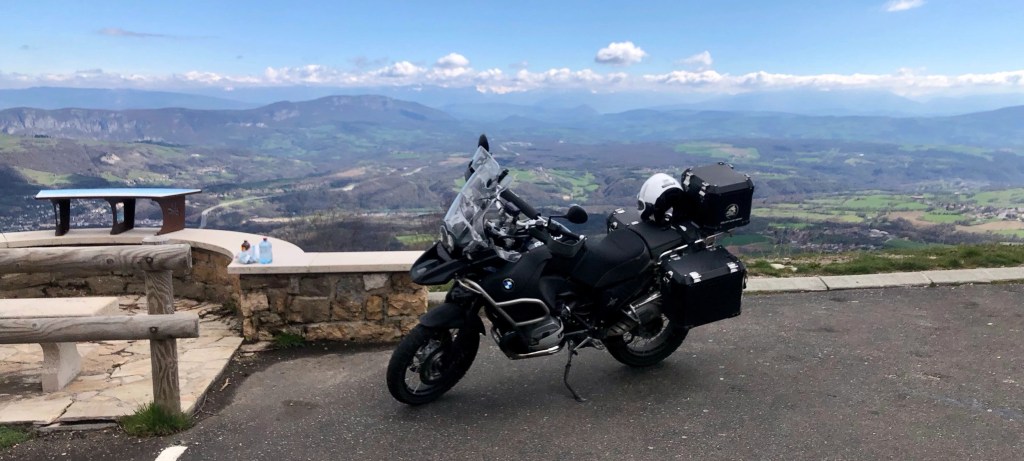 Samstag, 7. April: Entgegen meiner üblichen Angewohnheit, am Abend noch das Motorrad zu betanken, habe ich gestern die GS sozusagen ohne Abendessen ins Bett geschickt. Da aber die Tankstelle gegenüber dem Hotel liegt, sollte das kann Problem sein, dachte ich. Doch als ich an der Zapfsäule stehe, stelle ich fest, dass heute kein 98er Benzin mehr verfügbar ist. Zwei weitere Tankstellen muss ich besuchen, bis der Tank wieder voll ist. Durch die kalte Chartreuse und Aix-les-Bains steuere ich den Grand Colombier Pass an. Leider ist dieser noch im Winterschlaf und ich muss einen Umweg machen. Am Belvédère de Cuvéry et du Catray halte ich inne. Was für ein Panorama, vom Jura zu den Schweizer Alpen! Vor mir ein grünes Tal, und über Allem thront der mächtige Montblanc.
