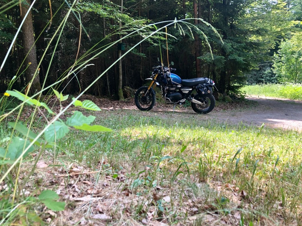 Hinter Bad Herrenalb fahre ich rechts im Wald auf einen Stichweg, kurze Pause machen. Der Weg ist leicht ansteigend. Statt in den ersten Gang zu schalten bleibe ich im neutralen Gang hängen. Und noch was Anderes bleibt hängen: mein rechter Stiefel an der Fußraste. Im Stand kippt der Scrambler unter mir nach rechts um. Ich kann das Gewicht noch einigermaßen abfangen und lege das Motorrad vorsichtig, aber rückenschädigend in den Schotter.