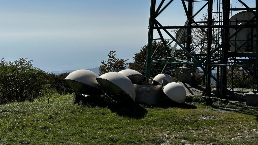 Oben am Monte Beigua stehen viele Antennenanlagen aus vergangenen Zeiten herum. Nur die zwischen ihnen stehende Kirche ist älter. Das Ganze hat einen morbiden Charme, doch es thront über einem grandiosen Ausblick.