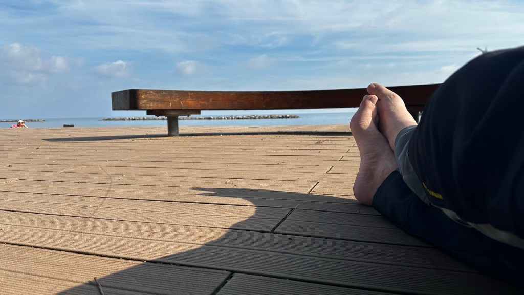 Um 15:30 bin ich im nächsten Hotel, direkt am Meer gelegen. Vor Ort stelle ich fest, dass die Gastgeber die Rezeption erst um 17:30 öffnen. Toll! Hatte mich auf ein Bad im Meer und spätsommerliches rumhängen in kurzer Hose gefreut. Wenigstens kann ich die Schuhe ausziehen, während ich warte.