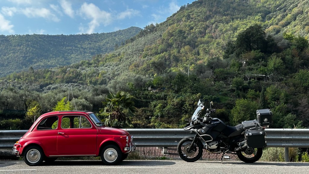 Ich gondele nun noch durch das Ligurisch-Piemontesische Hinterland, nicht ohne eine ausgiebige Mittagspause. An einem Supermarkt in San Bernardino spricht mich ein freundlicher Mann an, er ist mindestens 85. Er ist von meinem Motorrad sehr angetan, die BMW sei immer sein Traum gewesen. Leider habe er nie eine gehabt, er sei zu klein. Doch er wünscht mir eine gute Reise und so fahre ich über den Colle Dei Giovetti und durch das Forte Centrale Del Melogno meiner heutigen Unterkunft direkt am Strand entgegen. Mann, hab ich ein Glück: Ich habe Urlaub, es ist warm, ich bin groß genug für mein Moped. Nur Kirschen habe ich nicht.