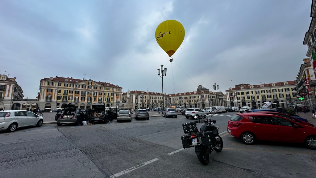 Morgens mache ich in Cuneo erstmal eine kleine Stadtrundfahrt. Die Stadt ist ganz hübsch und sehr symmetrisch mit Ballon. Doch den Rest des Tages kann das Wetter nicht mit den vergangenen Tagen mithalten. Den ganzen Tag fahre ich erst im Nebel und dann in den Wolken herum. Eigentlich ne super Strecke, die ich mir zusammengestellt habe. Auf und Ab. Auf und Ab. Auf und Ab. Doch leider schaue ich überall dort, wo ich einen Blick in die Ferne genießen wollte, in ein weißes Nichts. Schade.