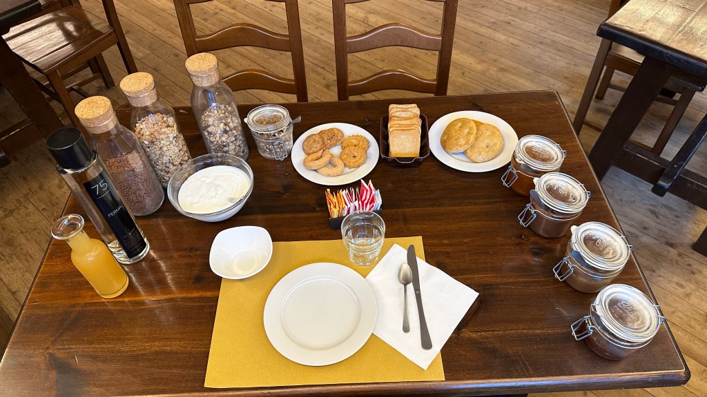 Heute morgen bin ich topfit und bin sehr angetan von meinen Gastgebern, die mir hier als einzigem Gast ein Frühstück rund um einen Teller bereitet haben. Ein Rührei kann ich sogar dazubestellen. Der Kaffee ist hervorragend.