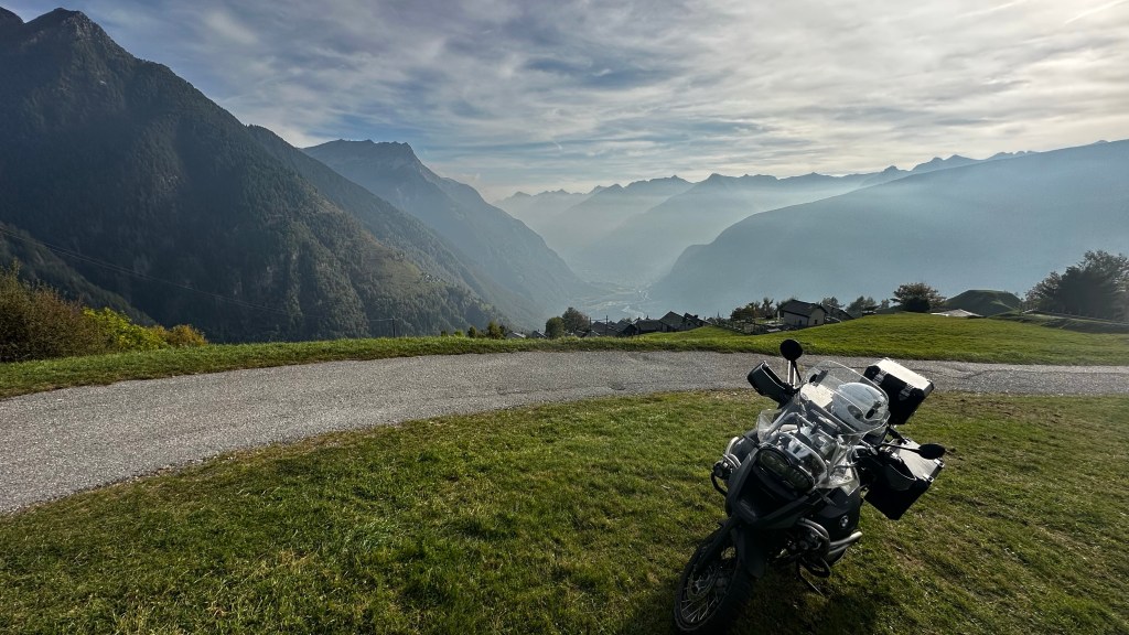 Bei Splügen biege ich ab und steuere den gleichnamigen Pass nach Italien an. Hier ist noch mehr Verkehr. Halb Süddeutschland ist hier unterwegs nach Süden. Gut, dass ich auf dem Motorrad unterwegs bin, so kann ich am Stau vorbeifahren. Am Comer See klettert das Thermometer auf 27 Grad. Spätsommer at its best! Die Nacht verbringe ich in einer zum Hotelzimmer umfunktionierten Wohnung mit Top Aussicht. So gefällt mir das!